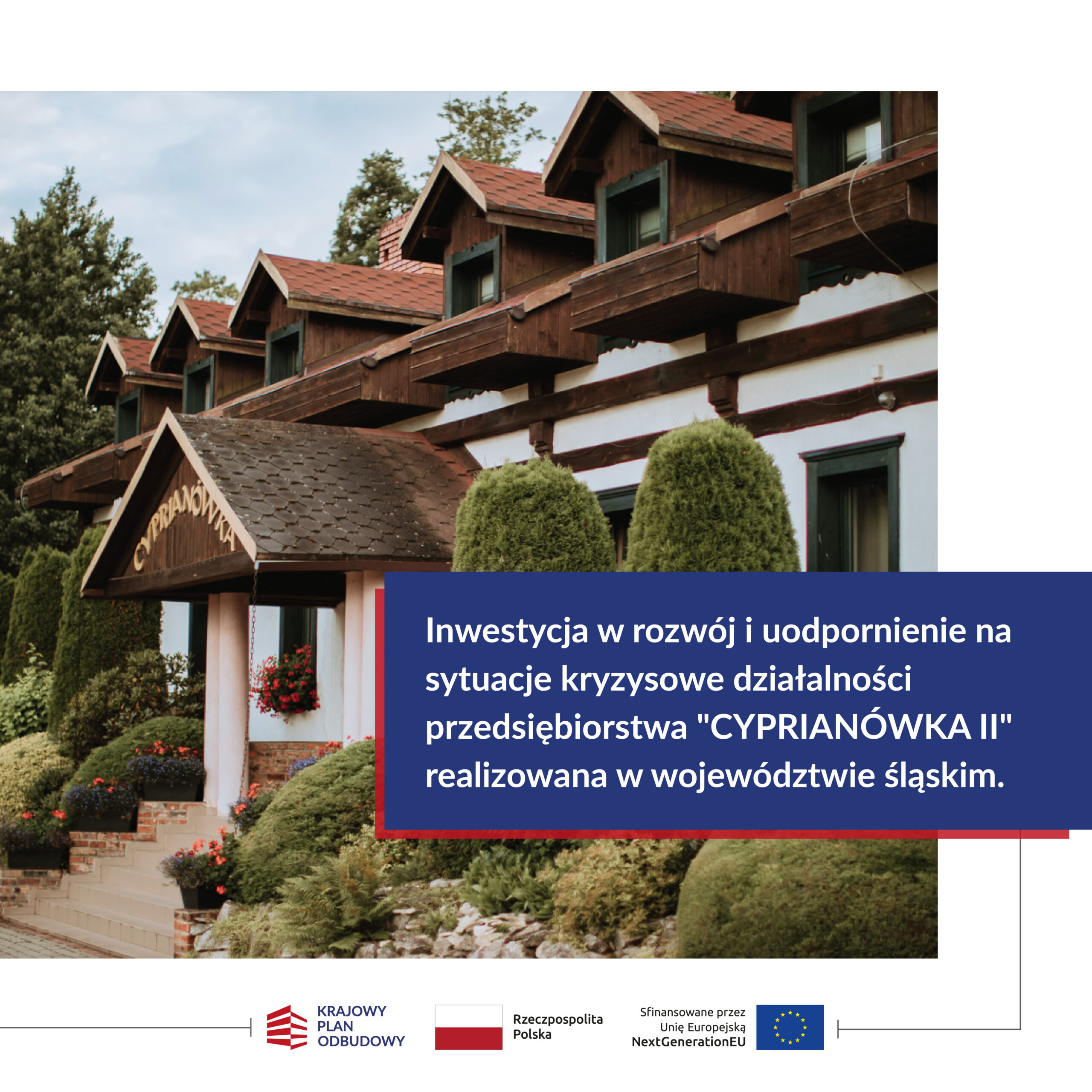 Z radością informujemy, że Cyprianówka uzyskała dofinansowanie w ramach Krajowego Planu Odbudowy i Zwiększania Odporności. Dzięki temu wsparciu będziemy mogli rozszerzyć naszą działalność, wprowadzając nowe usługi i jeszcze lepiej odpowiadając na potrzeby naszych gości.